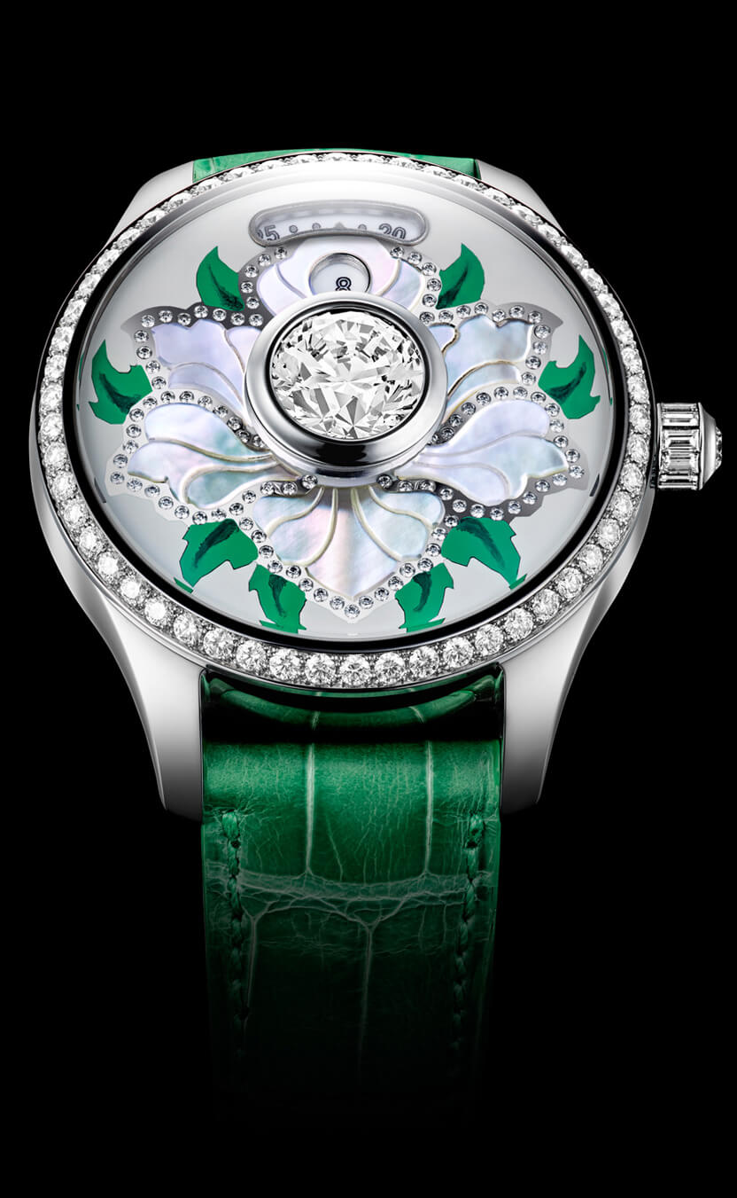 The dial is adorned with a flower engraved in mother-of-pearl, enhanced with hand-painted details and delicately set diamonds on the petals.