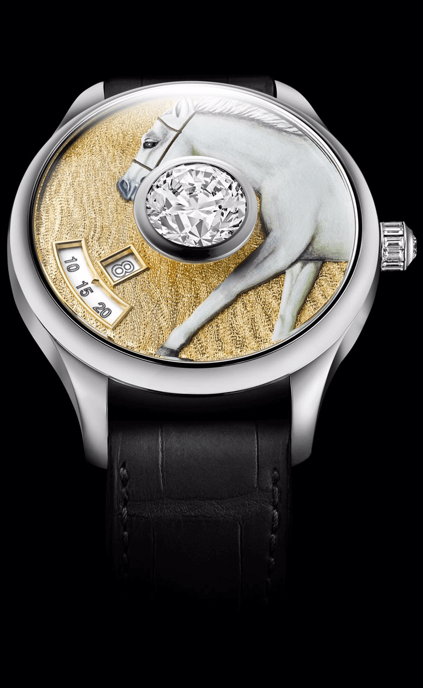 The dial showcases a majestic horse engraved in gold, then meticulously painted using micro-painting techniques, capturing every detail with exceptional finesse.